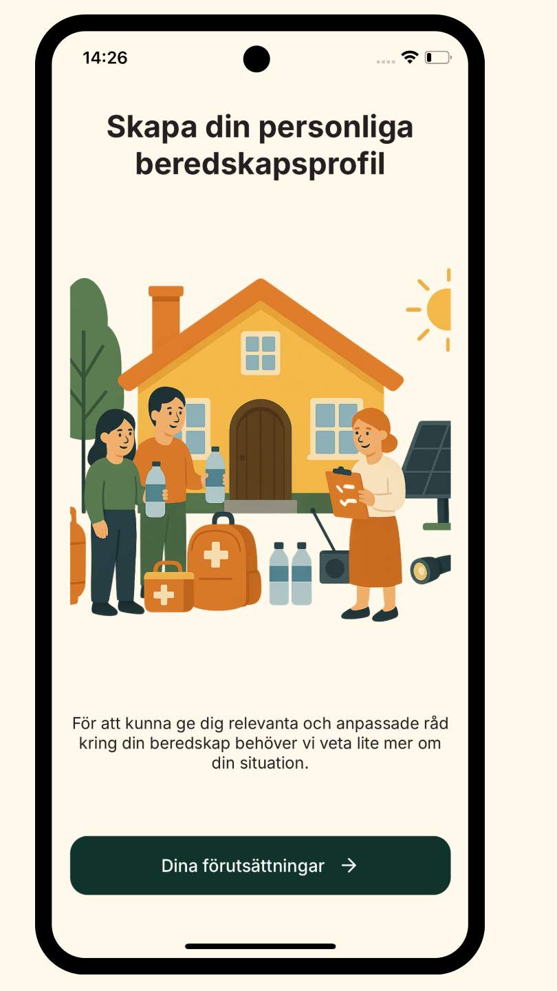 Appen hjälper dig att hålla koll på vatten, mat, ljus/värme, hygien, medicin, kommunikation och betalmedel – med checklistor, mikroutbildningar och råd anpassade efter ditt hem.